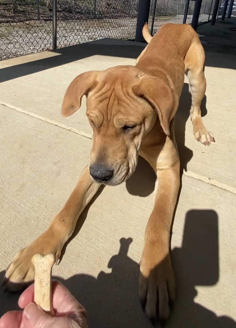Colby’s tan coat and stocky build give him a tough look, but meeting this huge goofball will quickly show any prospective owner his love and care for the humans. Positive reinforcement is Colby’s love language; don’t be surprised if you earn some extra cuddles with Colby after a particularly fun day of hiking, running trails and playing around in wooded valleys or muddy puddles – as long as he is by your side, he wouldn’t want to be anywhere else.