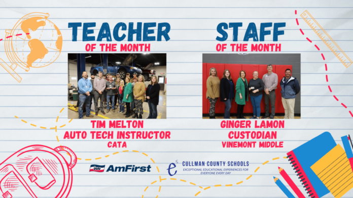 Cullman County Schools thanks America’s First Federal Credit Union for donating a $100 gift card to each employee of the month. Congratulations, Tim and Ginger!