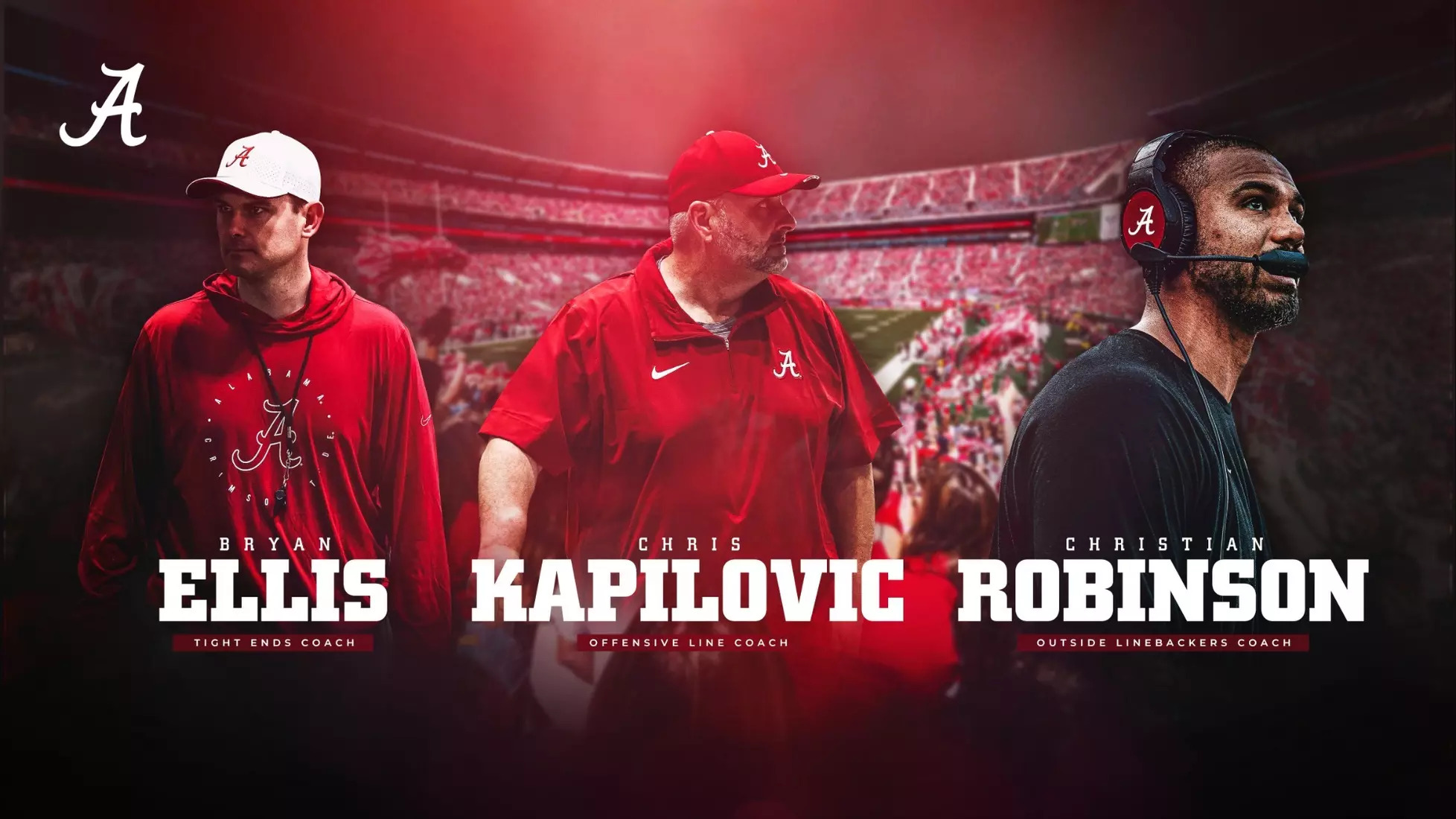 TUSCALOOSA, Ala. – Alabama head football coach Kalen DeBoer finalized his coaching staff Friday with the hiring of tight ends coach Bryan Ellis, offensive line coach Chris Kapilovic and outside linebackers coach Christian Robinson.