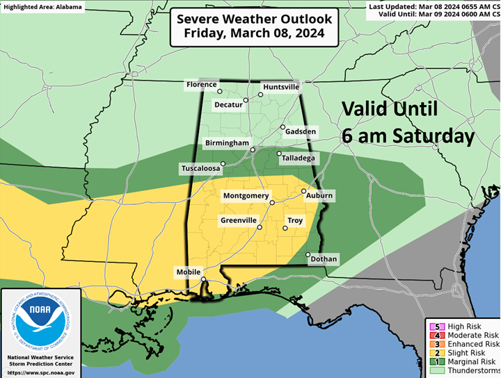 Additional thunderstorms will develop across the western portions of the state and move eastward this afternoon into Saturday morning. The threat for damaging winds and tornadoes could begin between 12-3 pm in the southern sections of Alabama and likely not until 6 pm – 12 am elsewhere.