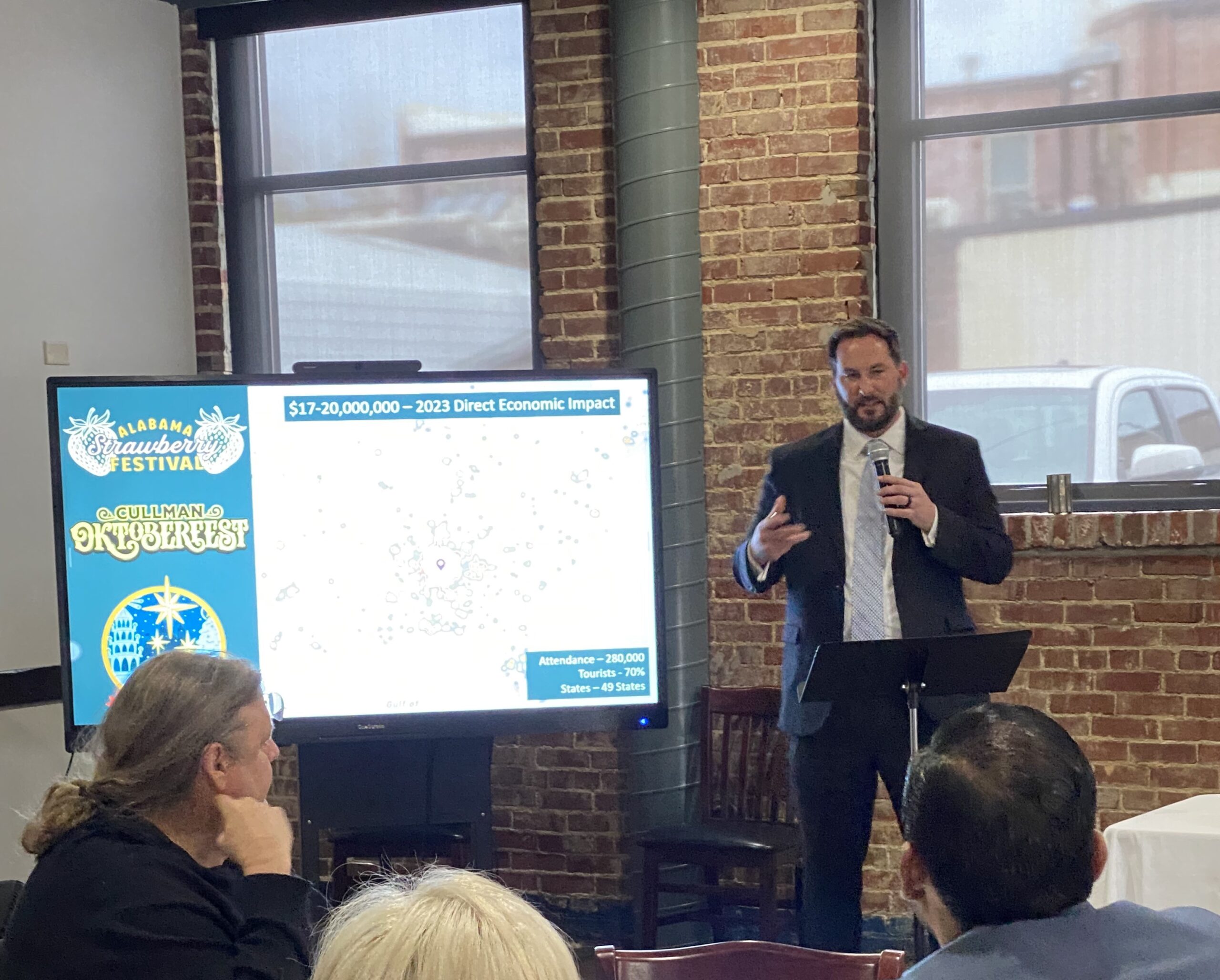 Anderson displayed an infrared heat map of Cullman, stating, “This is a heat map from our festivals. Attendance from last year’s festivals was 280,000 guests that came through to our city – 70% of these people are not from Cullman County; that’s what’s amazing.”