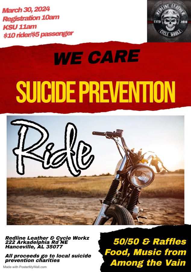 HANCEVILLE, Ala. – On March 30, the “We Care – Ride for Suicide Prevention,” motorcycle event aimed at raising awareness about suicide and supporting those affected by it, will take place at Redline Leather & Cycle Workz, located at 222 Arkadelphia Road NE in Hanceville. Registration for the event starts at 10 a.m., followed by the ride beginning at 11. The event aims to raise awareness among those affected by suicide and honor the memory of Albert Tubbs and Benjamin Gillilan, whose lives were tragically lost to suicide.