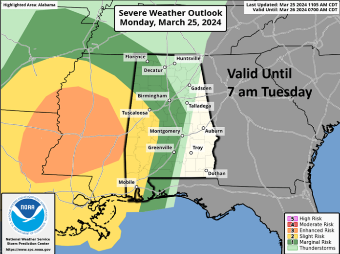 Damaging straight-line wind gusts and a few embedded tornadoes are possible in the western and southern portions of Alabama with a more isolated damaging wind threat and perhaps a brief tornado or two elsewhere across the risk area.
