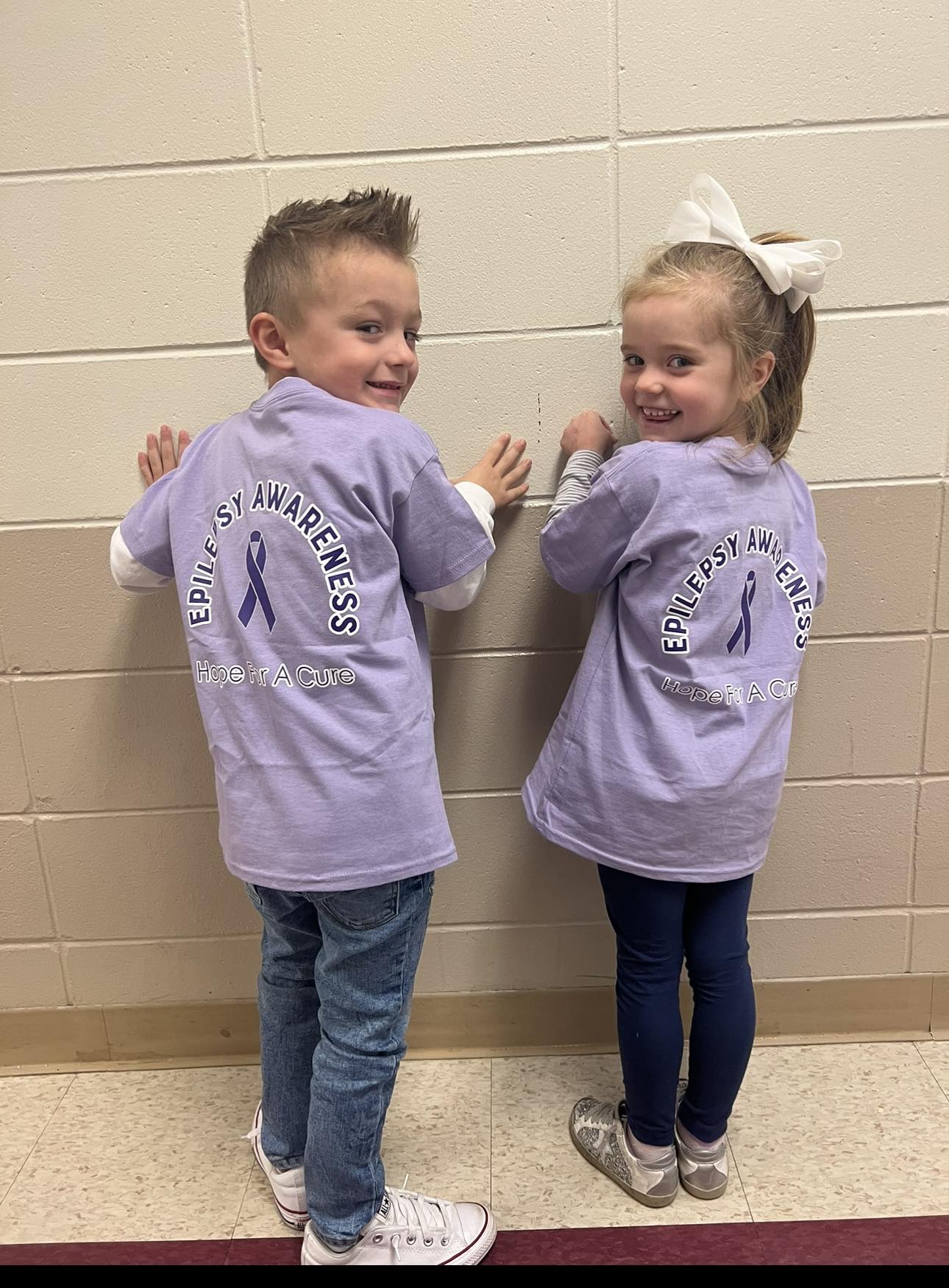 Ellie Mae Long and one of her best friends, Raiden Day, wear their purple on Purple Day to spread awareness about epilepsy and the triumph of her journey. (Maeghan Long)