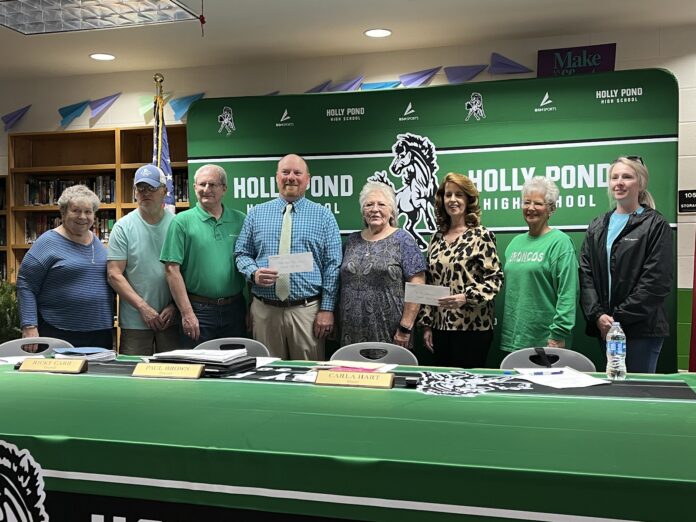 HOLLY POND, Ala. – The Holly Pond Town Council on Monday presented $5,000 checks to each of the town’s schools: to Holly Pond High School Principal Dr. Nate Ayers, and to Holly Pond K-8 Principal Karen Sparks. The presentation was made at a council meeting held at the high school library at Ayers’ invitation.