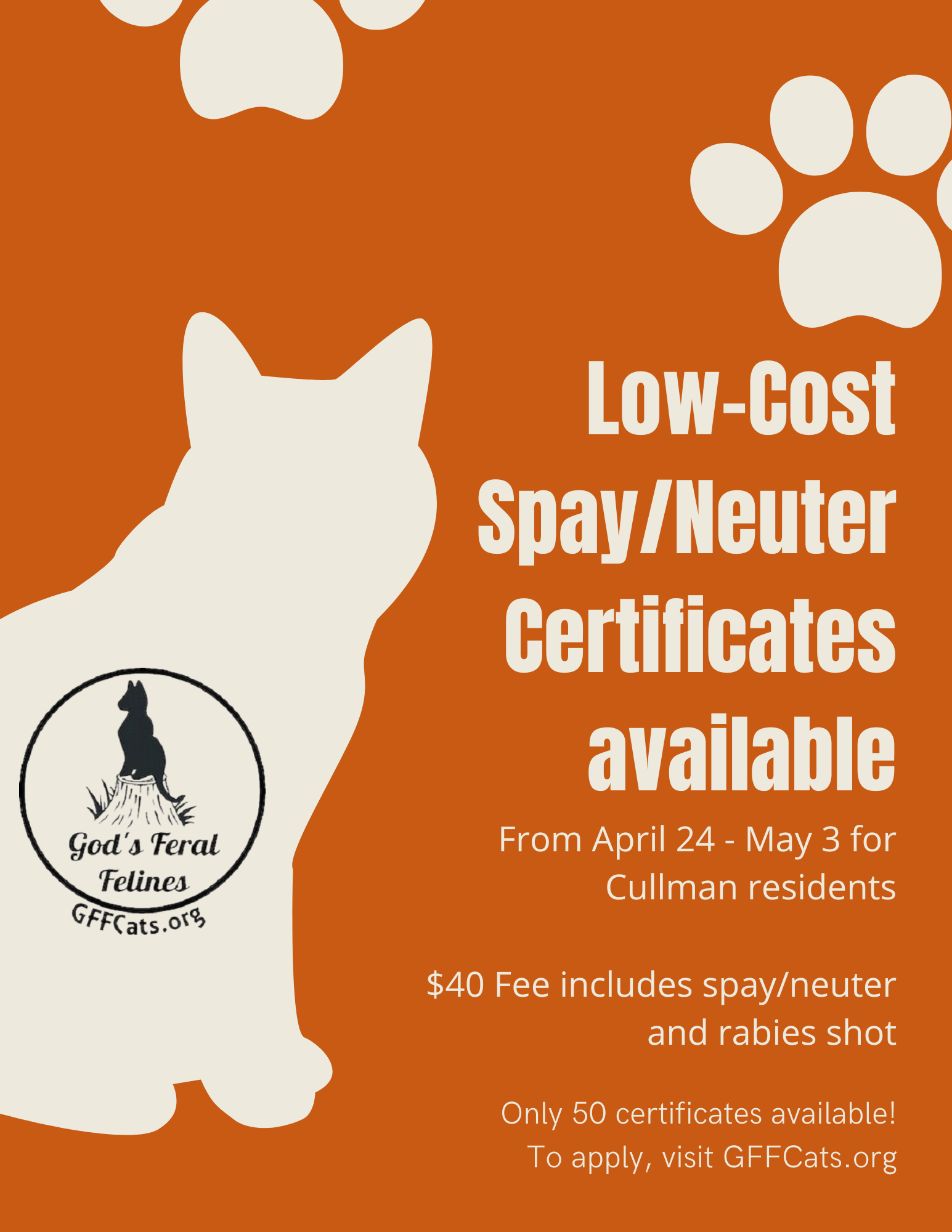 Until May 3, God’s Feral Felines will offer special $40 spay/neuter certificates as part of this initiative.