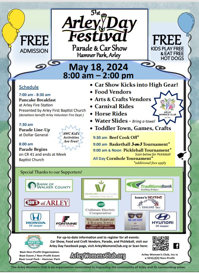 Arley Day will take place Saturday, May 18, from 8 a.m.-2 p.m. at D.H. Hamner Park in Arley. Get more info at https://tinyurl.com/Arley2024 or www.arleywomensclub.org/arley-day-festival.