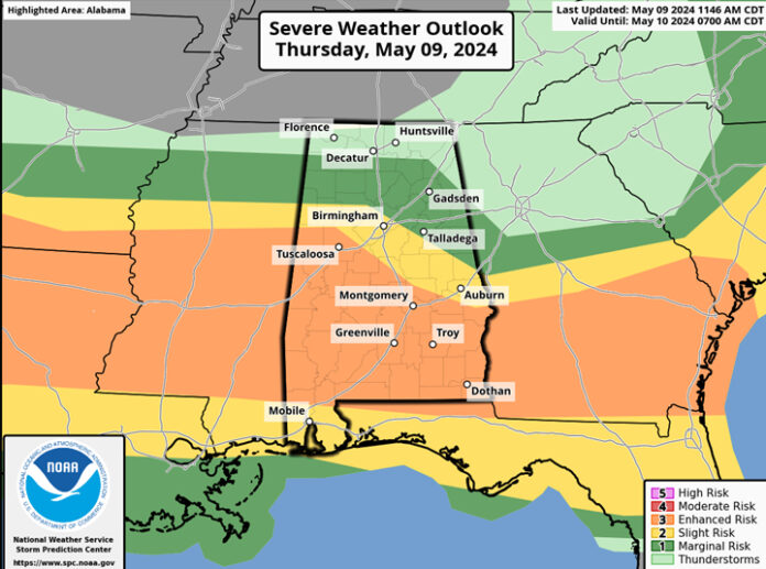 CLANTON, Ala. — Through 6 pm, the greatest threat of severe weather will be generally south of I-20 and east of I-65 where scattered to numerous thunderstorms will continue. Damaging wind gusts, hail, localized flash flooding and a tornado or two will be possible.