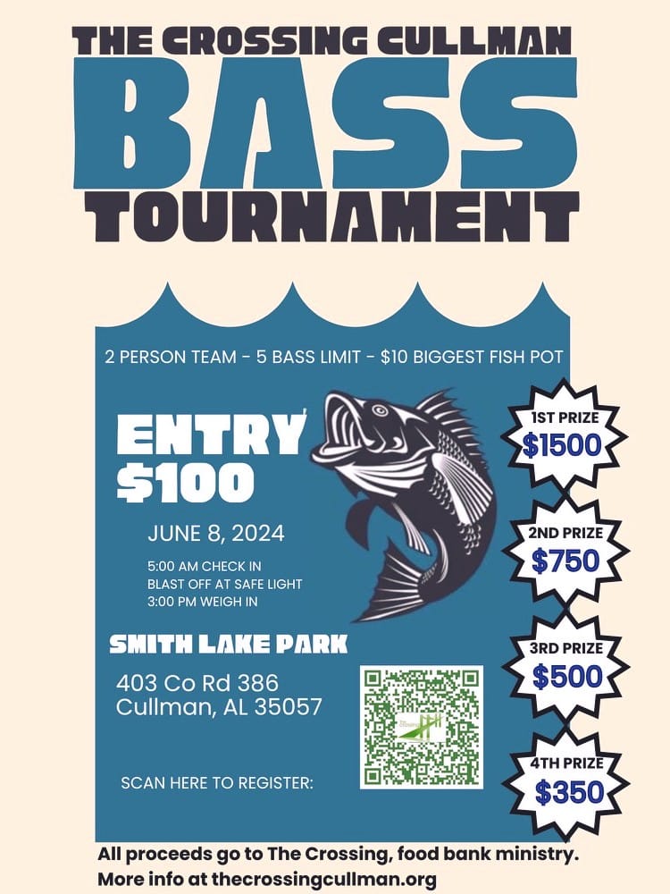 CULLMAN, Ala. – The Crossing, a local nonprofit dedicated to providing food and other services to those in need in Cullman, is excited to host its first-ever bass tournament on June 8 at Smith Lake Park. Anglers from the community and beyond are invited to participate. Check-in will begin at 5 a.m. with final weigh-ins scheduled for 3 p.m.