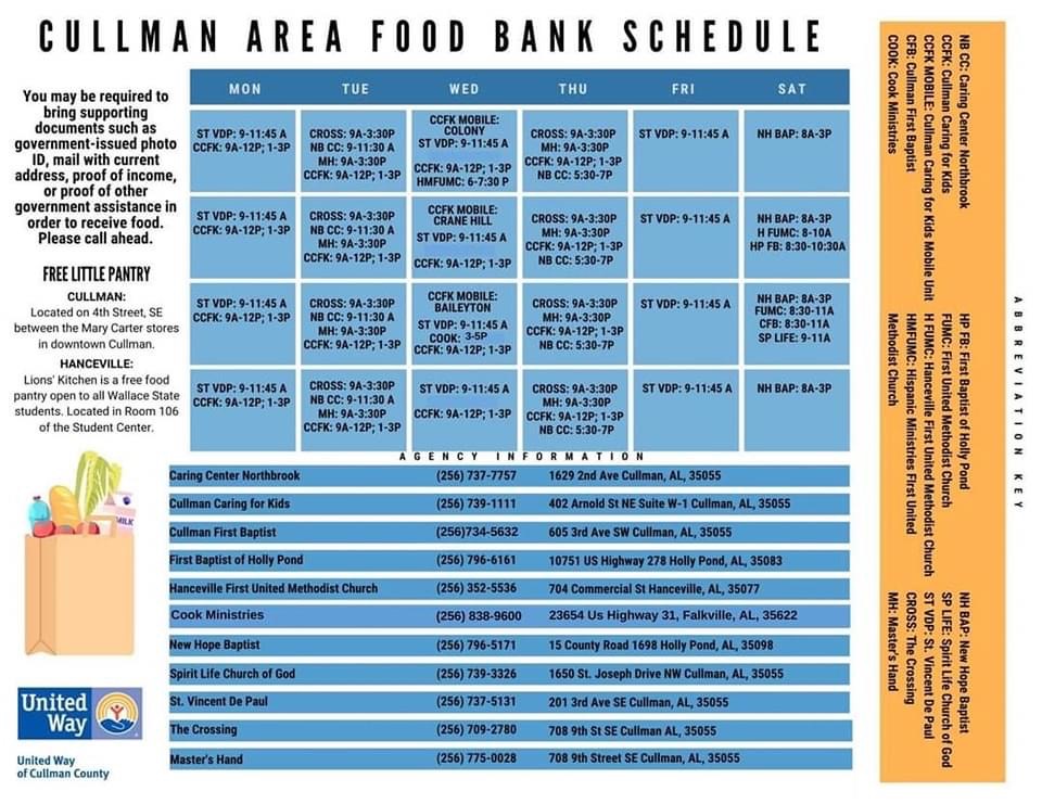 Cullman County is also home to multiple food banks and pantries. Check with each pantry for income and eligibility requirements and hours of operation.