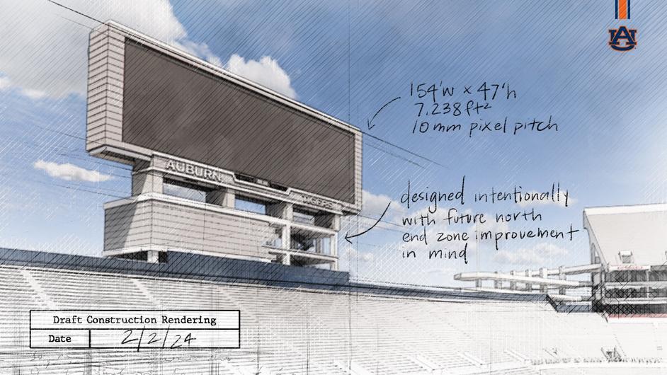 The north end zone videoboard project is expected to break ground in the summer of 2024 to be completed in time for the 2025 Auburn football season.