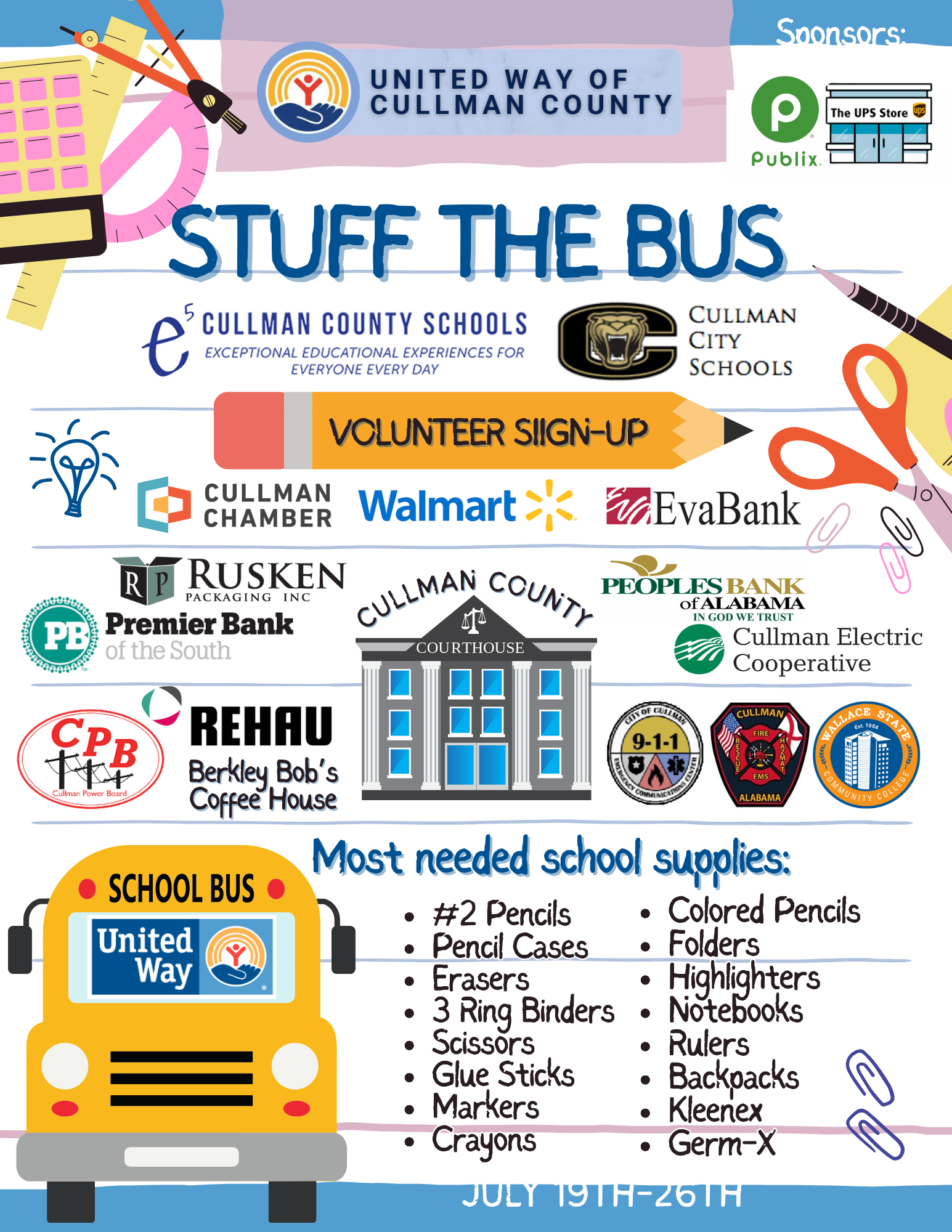 CULLMAN, Ala. – The seventh annual Stuff the Bus school supply drive is approaching, and volunteers are needed to make it a success. This hands-on opportunity allows community members to give back to students in need, ensuring they have the supplies necessary for a successful school year.