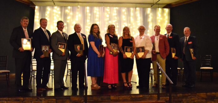 The Cullman County Sports Hall of Fame inducted the Class of 2024 at Stonebridge Farms Saturday night. Pictured L-R: Robin Conn, Dewayne Hill, Ray Dyer, Perry Hicks, Joey Graves (representative), Amanda Patrick, Hilary Stiefelmeyer, Regina Jones, Taft Dillashaw, Donnie Rice, Todd Lindsey. Not pictured: Jospeh W. Smith. (Nick Griffin/The Cullman Tribune)