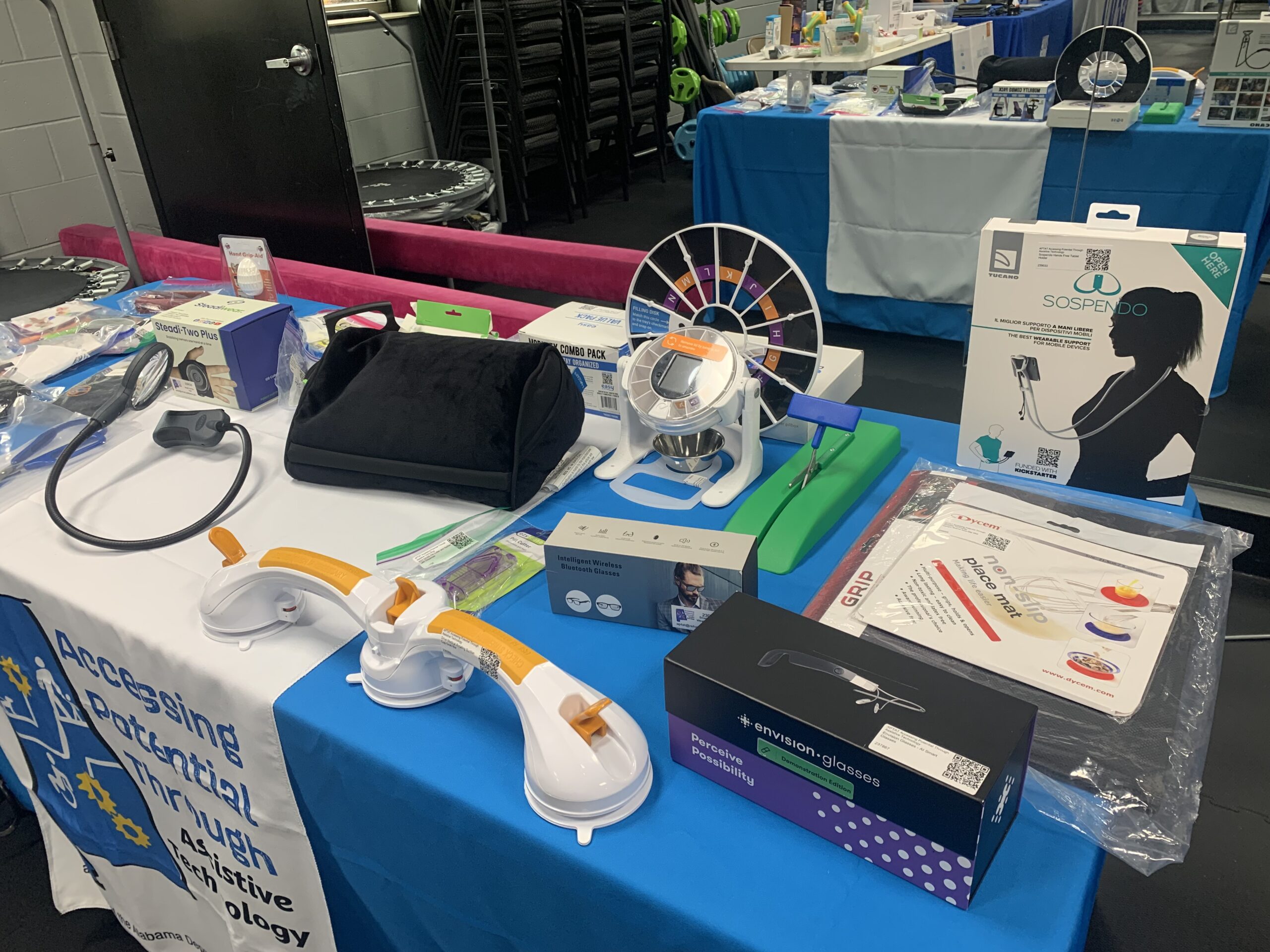 The assistive devices on display included several accommodations for various disabilities. Bite clicks and cursor tracking software and equipment allow computers to be used and navigated no matter the mobility of the user. Kitchen gadgets with sharp stakes to hold meat and produce for chopping and preparation, as well as a table full of adaptive toys for children with cognitive or physical impairments were on display.