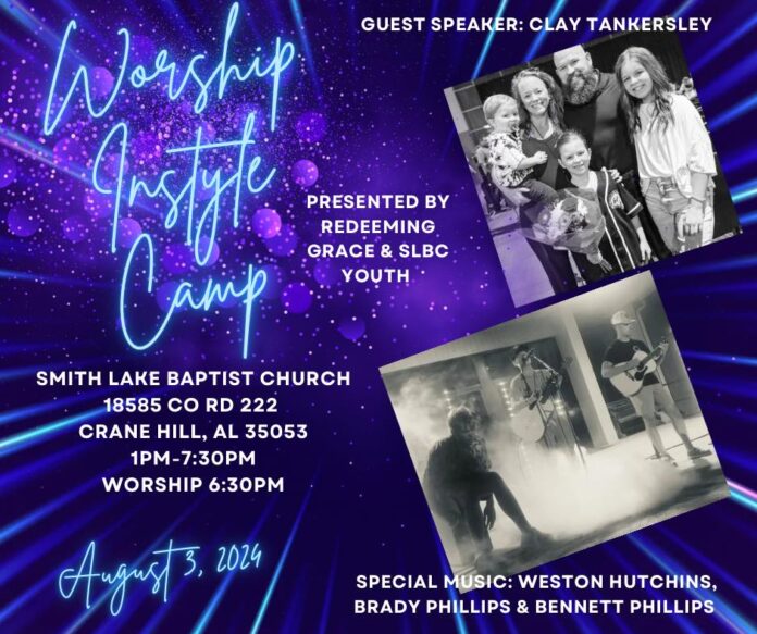 CULLMAN, Ala. – Smith Lake Baptist Church and Redeeming Grace Church are joining forces to host the annual Worship InStyle Camp at Smith Lake Baptist Church on Aug. 3, from 1-6:30 p.m. Clay Tankersley, associate pastor of Crossroads Baptist in Hayden, will deliver the message, and Weston Hutchins will lead the night of worship. Dinner will be served for all participants.