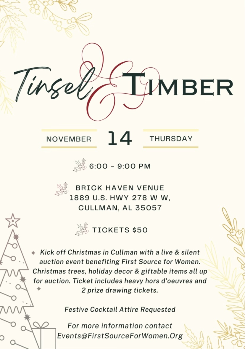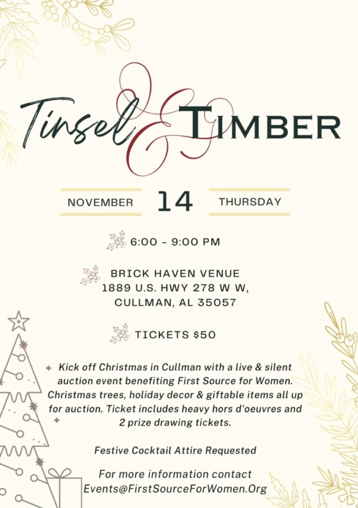 Tinsel & Timber will take place Thursday, Nov. 14, from 6-9 p.m. at Brick Haven Venue, 1889 U.S. Highway 278, Cullman, AL 35057. Festive cocktail attire is requested.