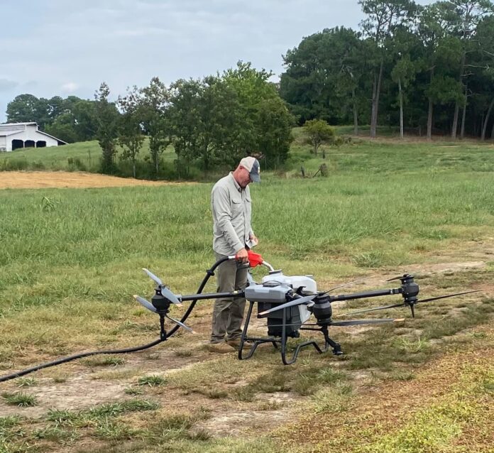 “It can spray pesticides on row crops, pasture and right of ways,” Mickle said. “It also has a dry hopper for spreading cover crops and dry fertilizer. The drone is battery powered, using a generator to recharge a rotation of three batteries. The drone allows us to operate when fields are wet, and we can do so without damaging the crop or compacting the soil. For row crops this means higher yields. The drone is precise, using GPS and RTK to create accurate mapping and grid patterns. This produces uniform and consistent application of pesticides and cover crops which lowers input cost on chemical and seed.”