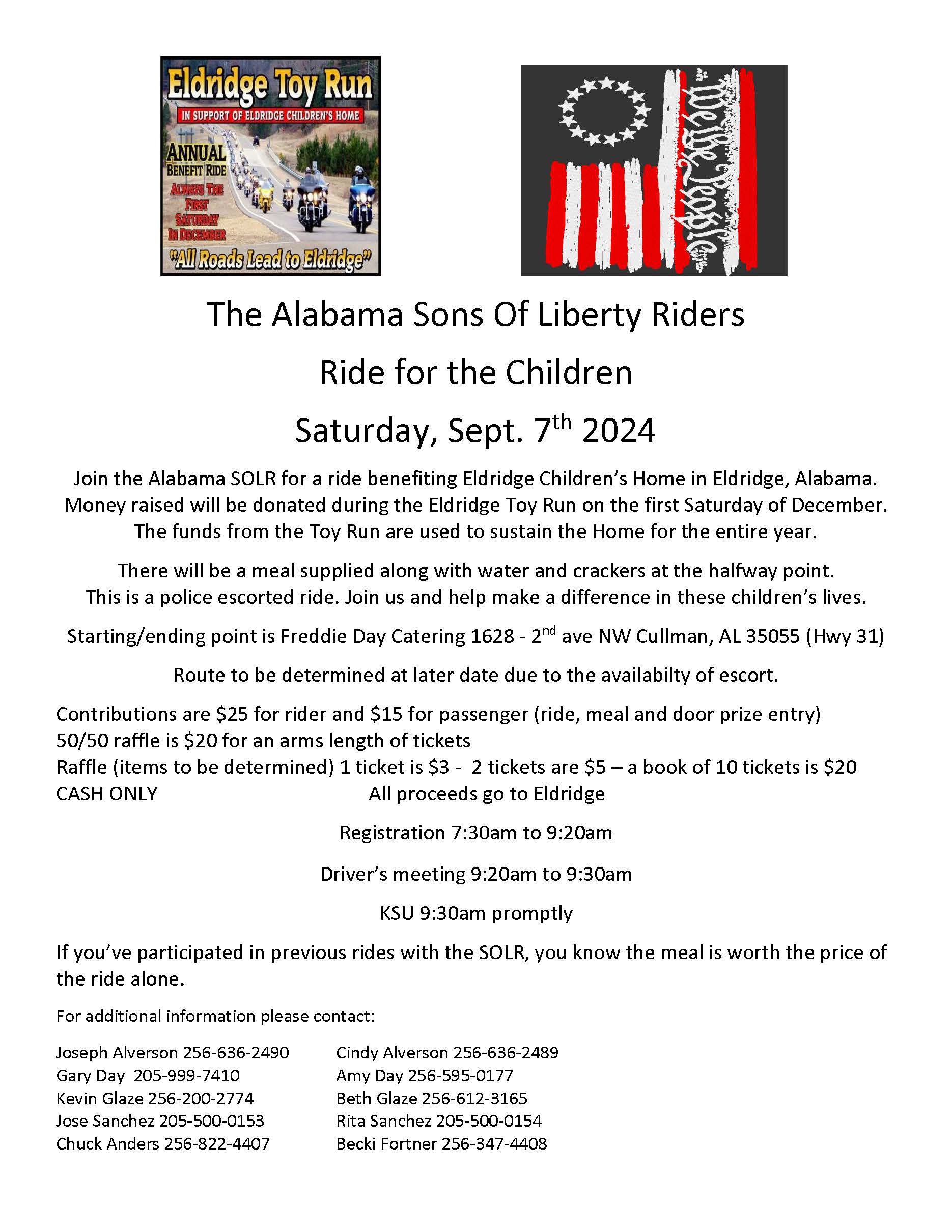 CULLMAN, Ala. – The Alabama Sons of Liberty Riders (SOLR) will be hosting a motorcycle ride on Saturday, Sept. 7, to benefit the Eldridge Children’s Home in Eldridge, Alabama. All funds raised from the ride will be donated during the Eldridge Toy Run in December, which helps sustain the Children’s Home for the entire year.