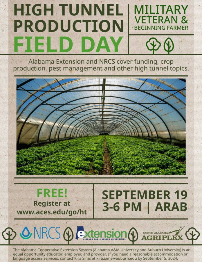 ARAB, Ala. – The Alabama Cooperative Extension System and Natural Resources Conservation Service (NRCS) are partnering to host a High Tunnel Production Field Day on Sept.19 from 3-6 p.m. at Bare Bottom Farm in Arab. This free event is specifically designed for military veterans and beginner farmers interested in learning about high tunnel production, a method used to extend the growing season for fruits and vegetables.