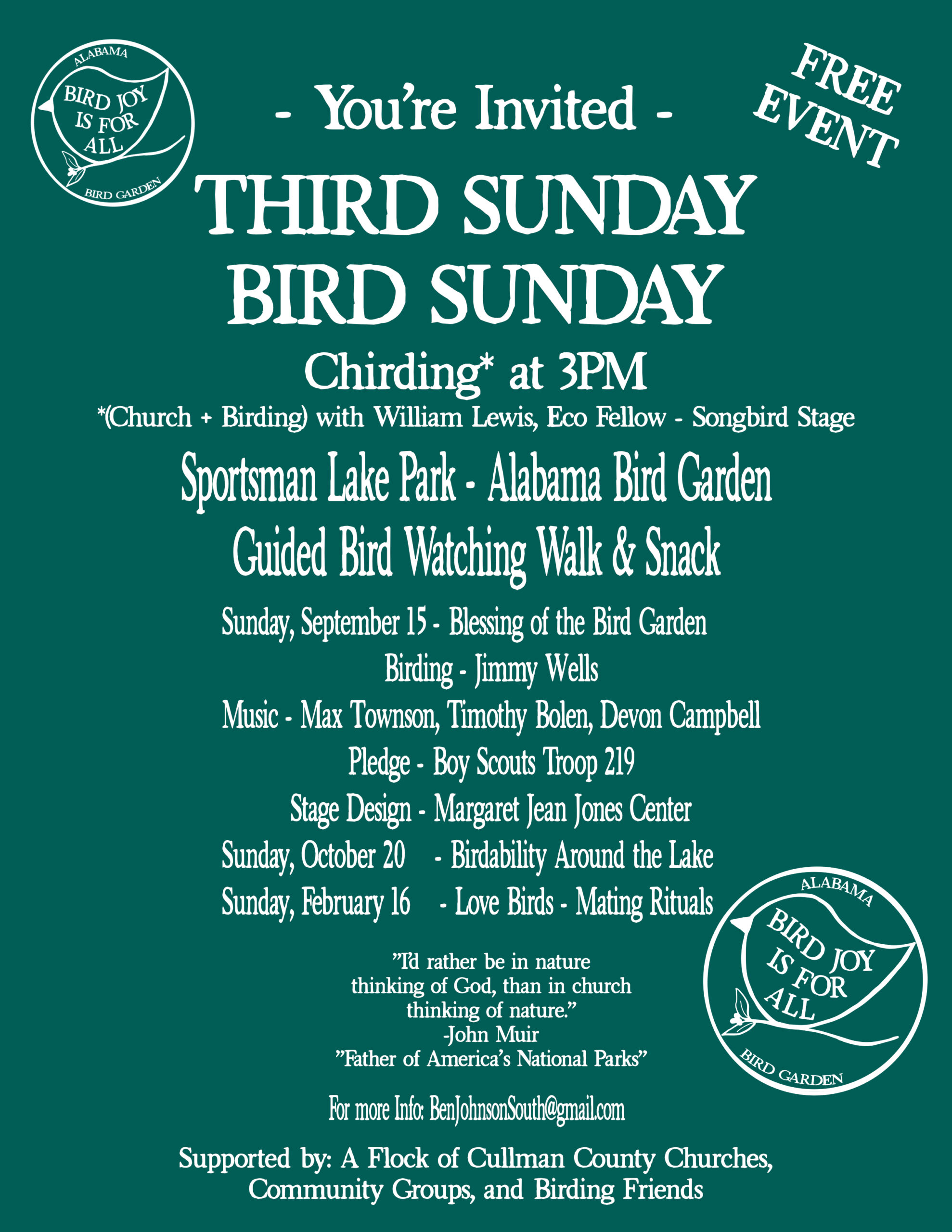 CULLMAN, Ala. – On Sunday, Sept. 15, at 3 p.m., Sportsman Lake Park will host the Third Sunday Bird Sunday event, located at the SongBird stage (the old bandstand) and pavilion No. 6. This unique event, combining church and birdwatching, known as “chirding,” was originally developed in Cullman.