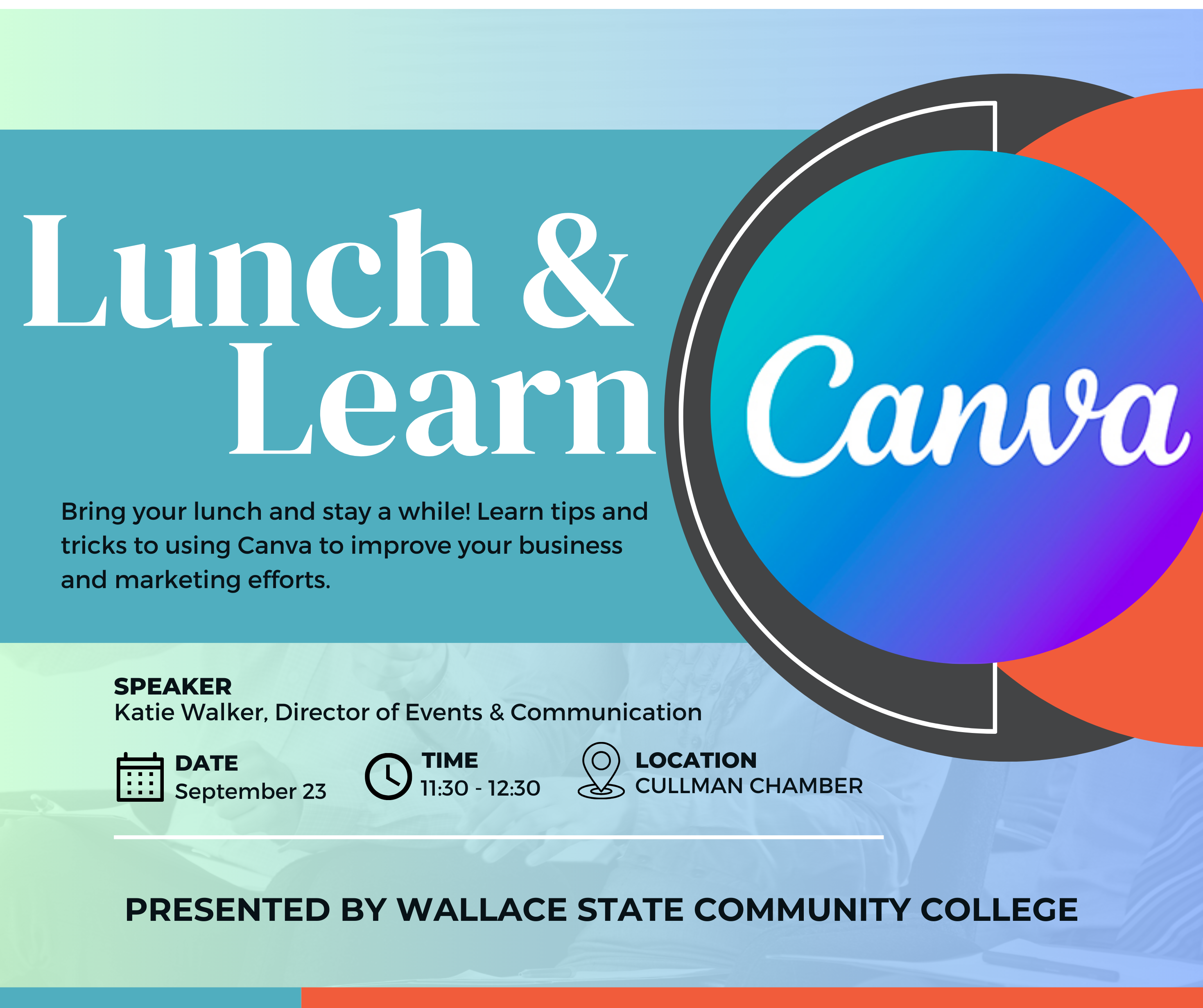 CULLMAN, Ala. – The Cullman Area Chamber of Commerce is hosting a Lunch & Learn workshop on Canva Basics, part of a series sponsored by Wallace State Community College. This event will take place on Monday, Sept. 23, from 11:30 a.m.-12:30 p.m. Designed for anyone looking to enhance their graphic design skills, the workshop offers a hands-on learning experience with Canva, a user-friendly tool ideal for creating eye-catching visuals for social media, presentations and more.