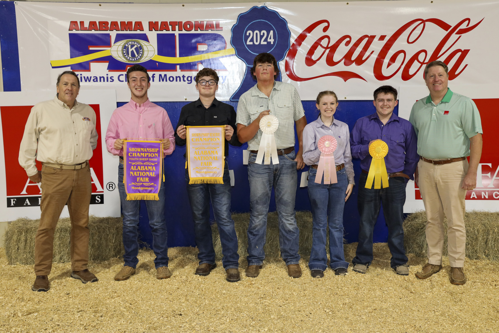 Intermediate Showmanship winners in the Youth Sheep Show at the Alabama National Fair Oct. 12 in Montgomery were, from left, Ella Alldredge of Blount County, grand champion; Amiliano Wrenn of St. Clair County, reserve champion; Mason Smith of Marshall County, third place; Jackson Hill of Chambers County, fourth place; and Khison Alldredge of Cullman County, fifth place. Intermediate Showmanship is for exhibitors ages 13-15. Alabama Farmers Federation and Alfa Insurance sponsored youth livestock events at the fair. The winners are pictured with Paul Hodges of Montgomery County Kiwanis Club, left, and Federation Executive Director Paul Pinyan, right. (Alfa Farmers)