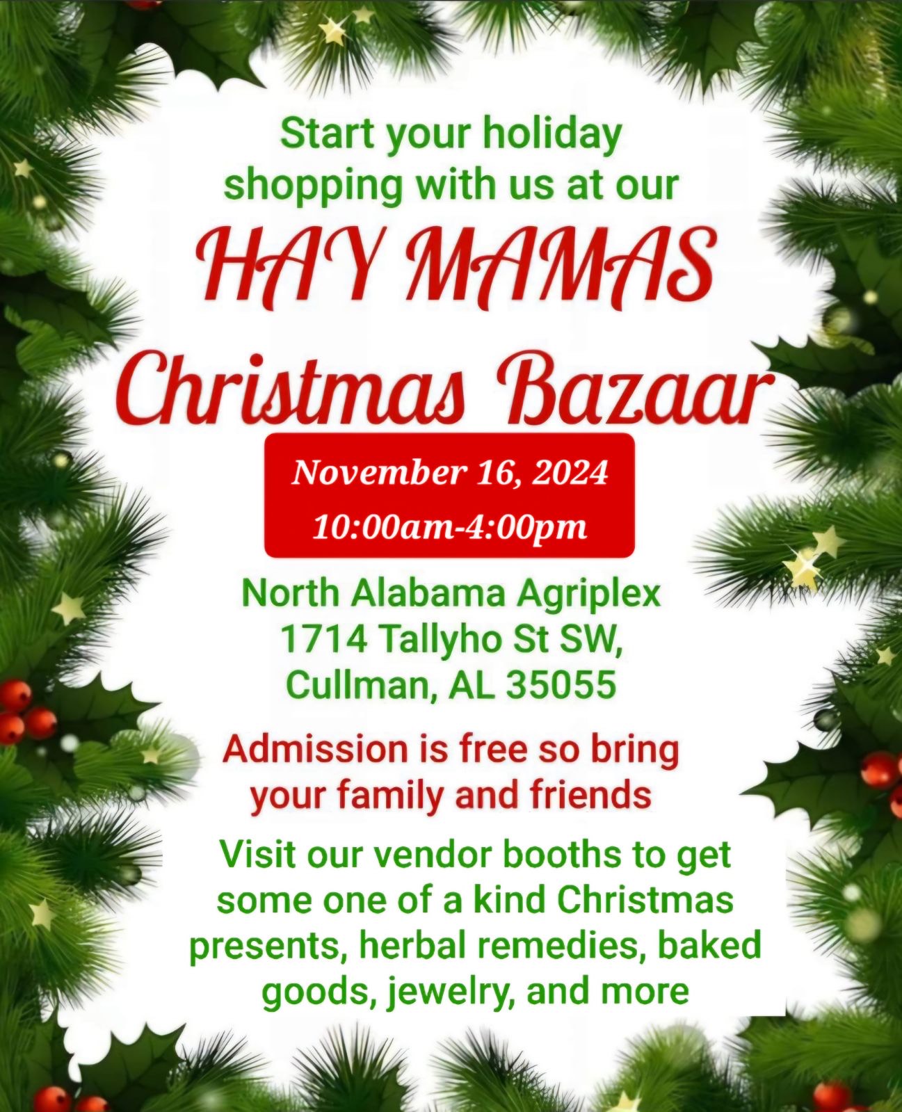 CULLMAN, Ala. – The HAY Mamas Christmas Bazaar will be held at the North Alabama Agriplex Saturday, Nov. 16, from 10 a.m.-4 p.m.