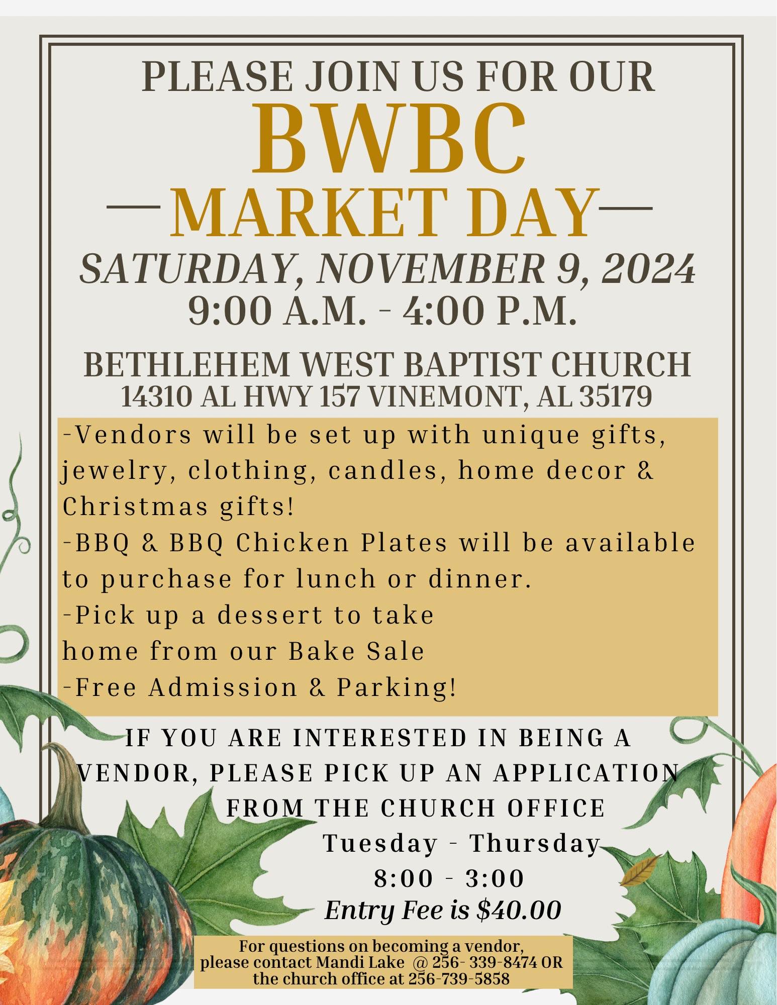 CULLMAN, Ala. – Bethlehem West Baptist Church will host its annual Market Day on Saturday, Nov. 9, from 9 a.m.-4 p.m. The event promises a full day of shopping, barbecue and community fellowship, offering a great way to kick off the holiday season. Admission and parking for Market Day are free.
