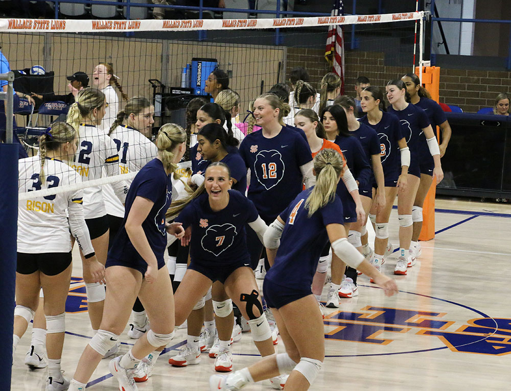 Wallace State freshman Kailey Dickerson of Wellington celebrates with other teammates after defeating Southern Union at the last regular season game for the Lions Volleyball team. The team will compete this weekend at the Alabama Community College Conference Volleyball Championship at Sand Mountain Park in Albertville. Their first match-up will be against Bishop State on Friday, Nov. 1 at 2 p.m. (WSCC)