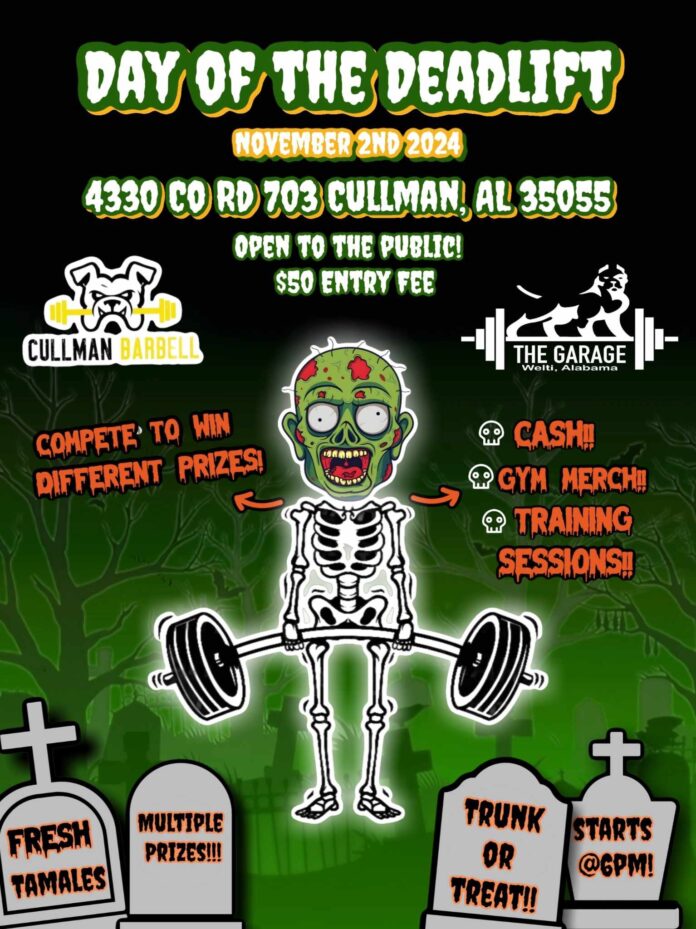 For more information on the event, contact The Garage at 256-962-0463 between 4-8 p.m. or visit the Day of the Deadlift event page at https://tinyurl.com/DayoftheDeadliftCullman.