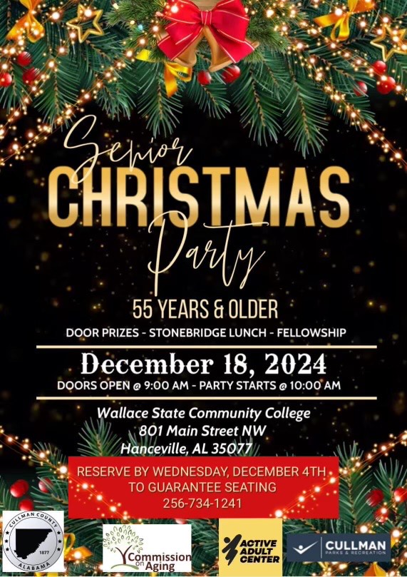 CULLMAN, Ala. – The Cullman County Commission on Aging (COA) will host its annual Senior Christmas Party for Cullman County residents 55 and older on Wednesday, Dec.18, at Wallace State Community College’s Tom Drake Coliseum. Reservations to the annual favorite event must be made by Wednesday, Dec. 4. This is a completely free event