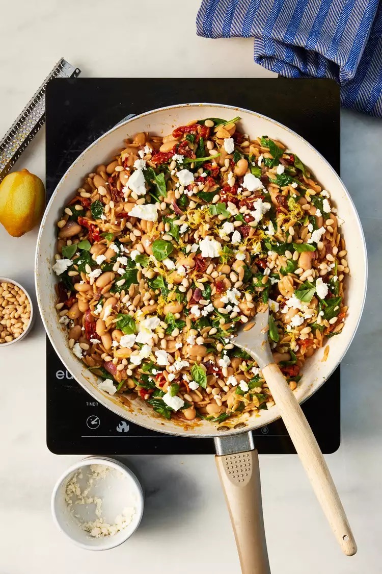 Source: www.eatingwell.com/one-pot-white-bean-spinach-sun-dried-tomato-orzo-with-lemon-feta-8415910