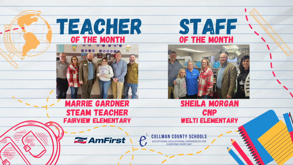 Cullman County Schools thanks AmFirst for sponsoring this program. Each Teacher and Staff Member of the Month receive a $100 gift card.