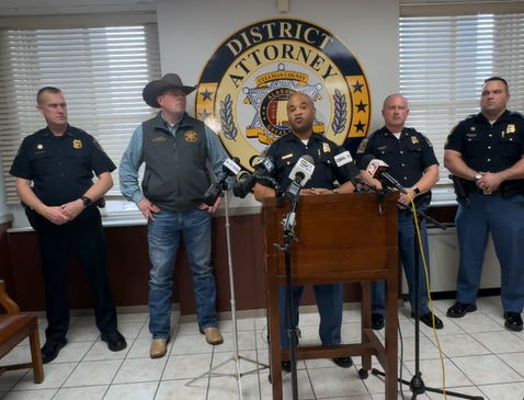 Senior Alabama State Trooper Brandon Baily speaks at a press conference held Monday, Dec. 9, 2024. Left to right are Cullman Police Chief Joey Duncan, Cullman County Sheriff Matt Gentry, Bailey and two other Alabama State Troopers. (Screen capture from Facebook/Cullman Sheriff)