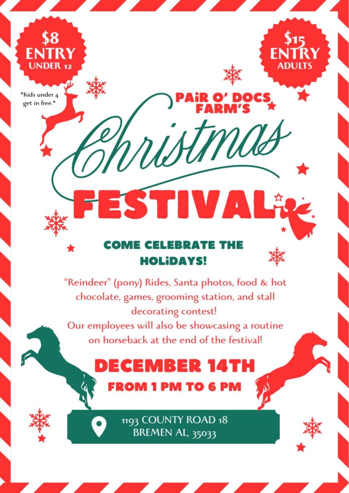 BREMEN, Ala. – Pair O’ Docs Farm will host its Christmas Festival on Saturday, Dec. 14, from 1-6 p.m.
