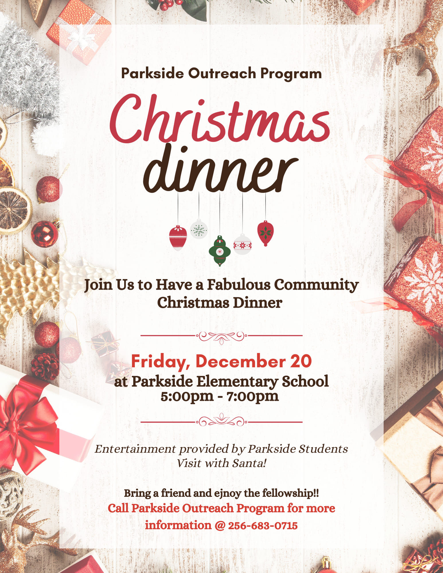 BAILEYTON, Ala. – The Parkside Outreach Program invites the community to its annual Christmas dinner on Friday, Dec. 20, from 5-7 p.m. at Parkside Elementary School. This free event offers a sit-down meal in the school’s lunchroom or convenient to-go plates for those unable to stay.