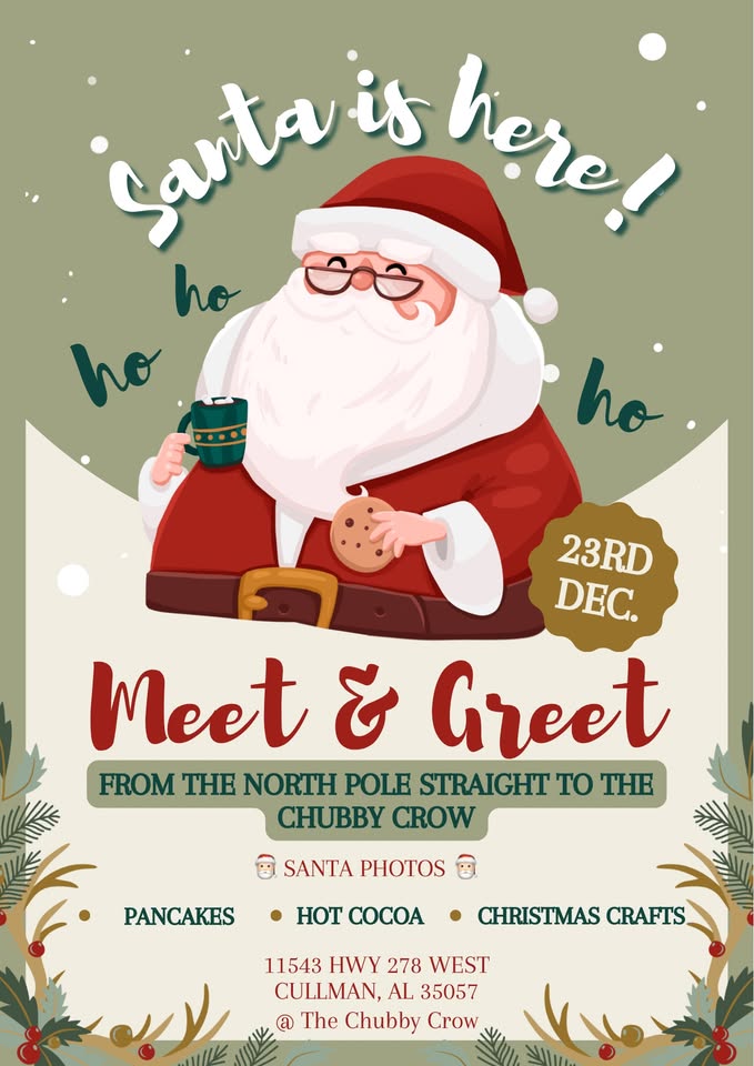 CULLMAN, Ala. – On Monday, Dec. 23, from 7-10 a.m., The Chubby Crow will hold a special Breakfast with Santa event.