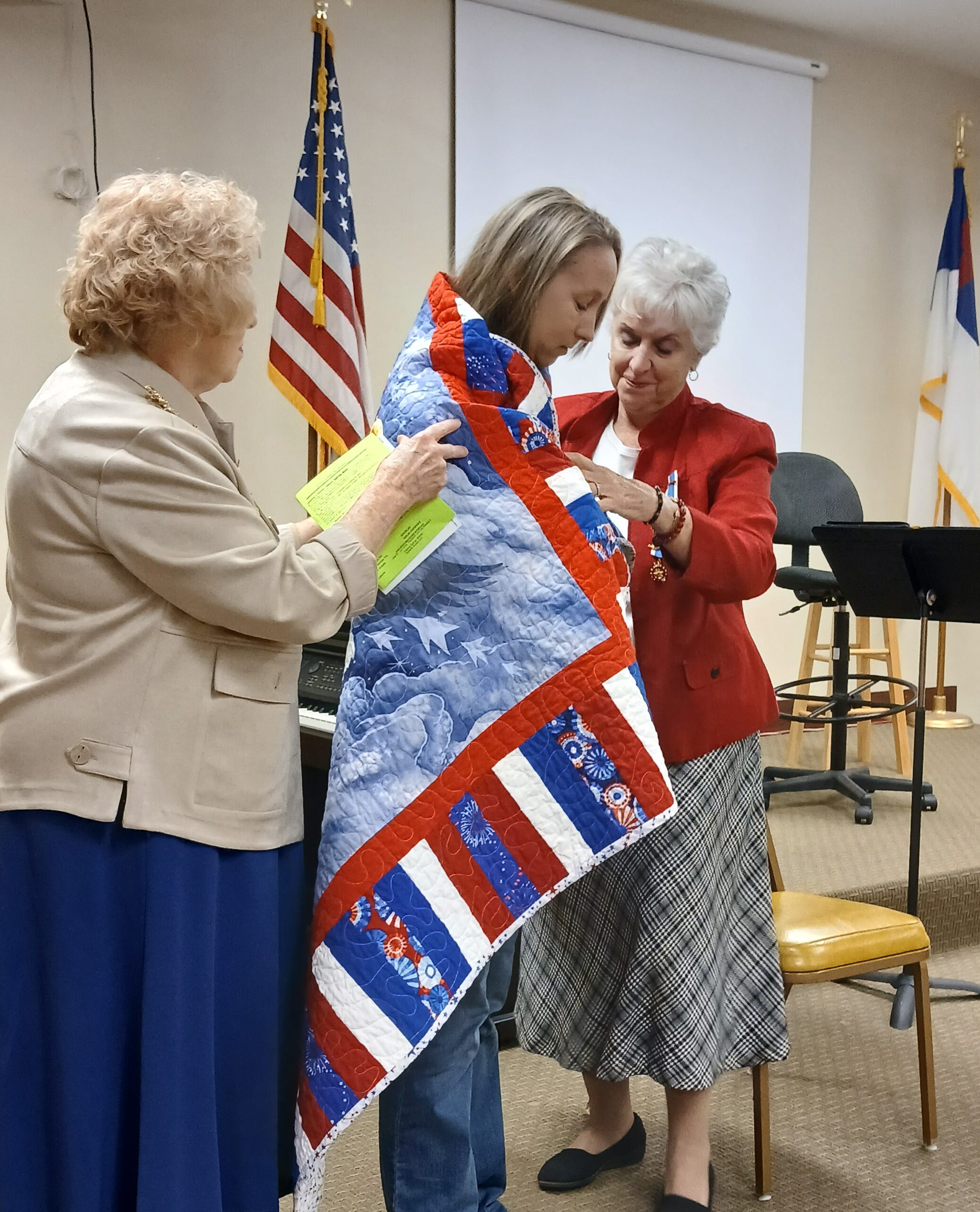 The quilt, pieced together by members of the Dripping Springs Chapter as part of the DAR Day of Service in October, was later machine quilted and officially registered with the Quilts of Valor Foundation. According to the foundation, “A Quilt of Valor is a quality, handmade quilt that is machine or hand-quilted. It is awarded to a service member or veteran who has been touched by war. It says unequivocally, ‘Thank you for your service and sacrifice in serving our nation.’”