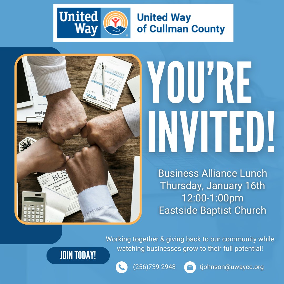 CULLMAN, Ala. – The United Way of Cullman County invites business owners to its Business Alliance Lunch on Thursday, Jan. 16, from noon-1 p.m. at East Side Baptist Church in Cullman.