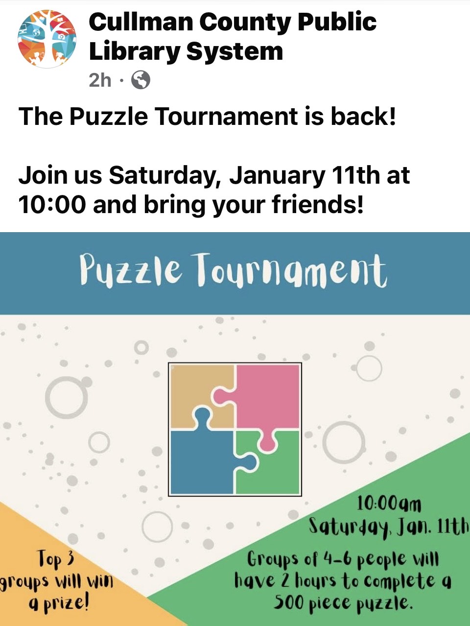 CULLMAN, Ala. – The main branch of the Cullman County Public Library System (CCPLS) is hosting a Puzzle Tournament on Saturday, Jan. 11, 10 a.m.