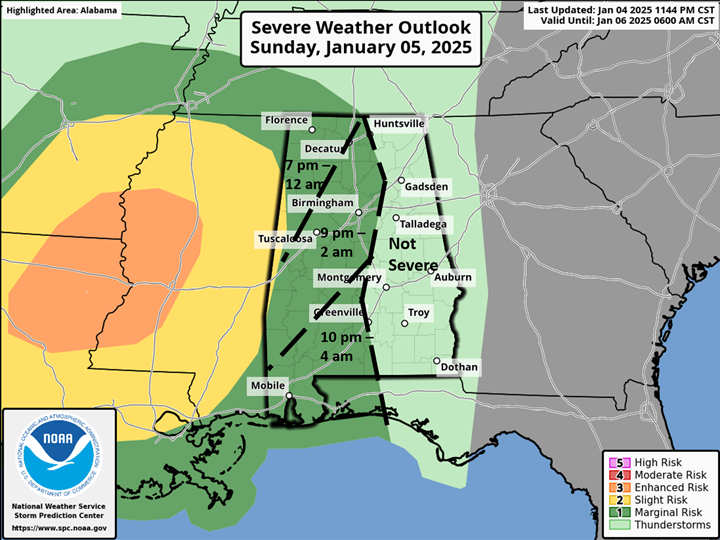 Winds behind a strong cold front will contain gusts across the state from 25-35 mph through this afternoon. Snow showers or flurries will occur later this morning through the afternoon as far south as a Livingston – Montgomery – Auburn line. A few flurries will continue through tonight well north of I-20. Most locations will have no accumulation nor impacts, except for far northern Alabama where up to 0.5 inch is possible, mainly in grassy areas.