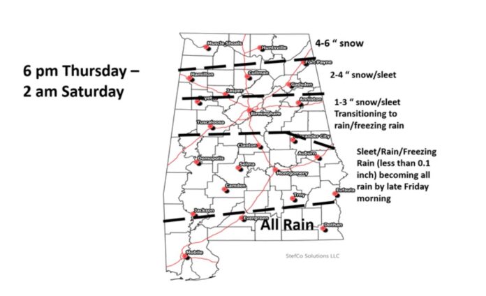 CLANTON, Ala. – Models continue to indicate an area of low pressure will develop over the northwestern Gulf of Mexico Thursday and move northeastward, reaching the southeastern Atlantic coast on Saturday. The exact track of the low pressure system across the northern Gulf will have direct impacts on winter precipitation locations and accumulations, and there still remains uncertainties.