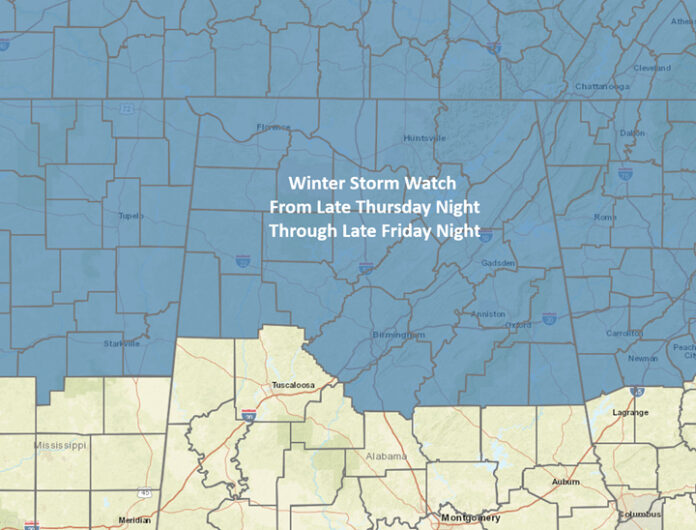 Precipitation will begin to enter the western portions of the state after 9 pm Thursday and spread across all of Alabama between 12am and 6am Friday.