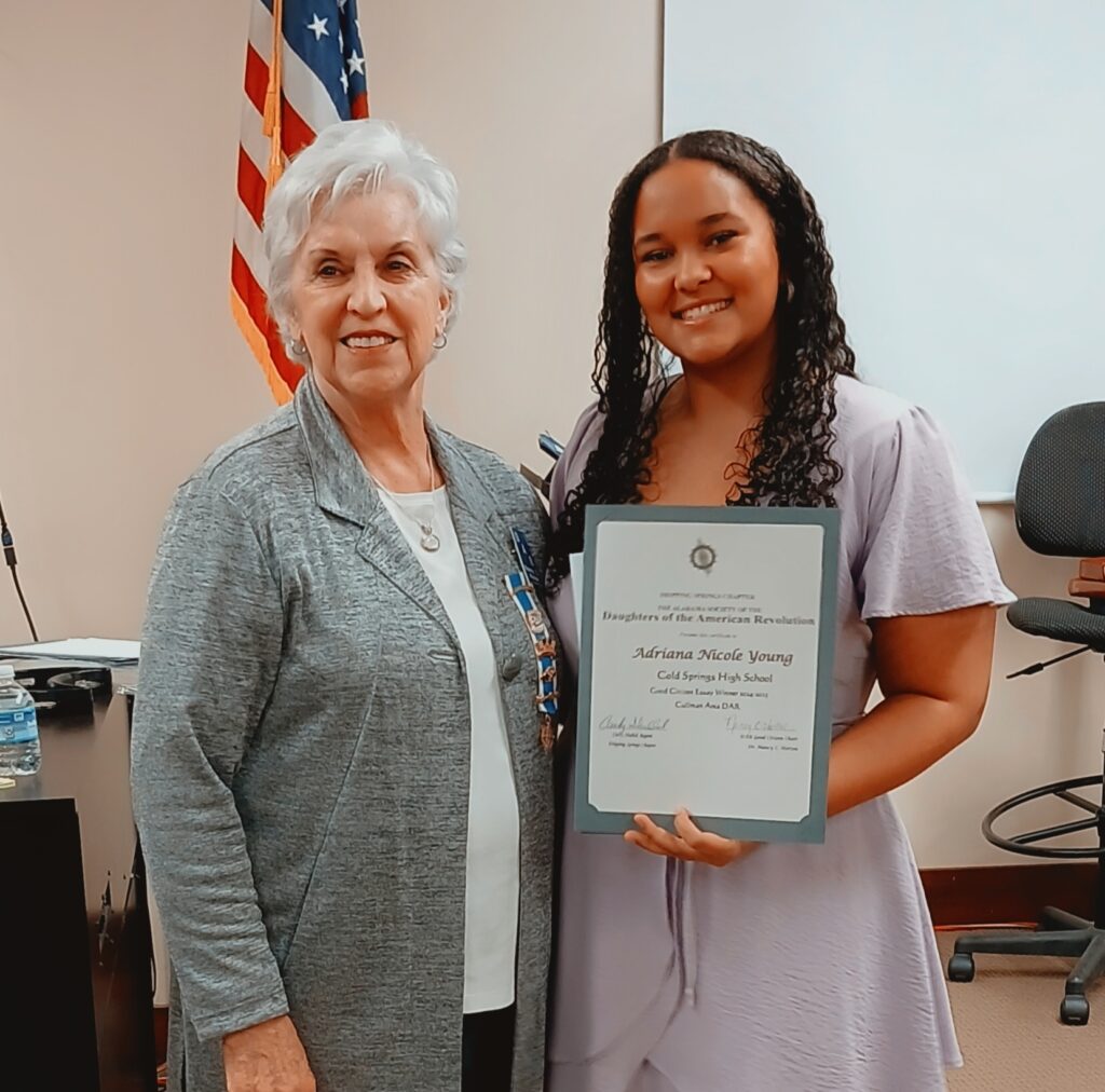 Those who opted to compete in the DAR Good Citizens Essay contest were judged based on the topic of “How can service to my community lead to a better America.” Three judges each scored the essay entries separately. After the scores were averaged only one point separated the winner from the runner-up entries. The Essay contest winner was Adriana Nicole Young from Cold Springs High School. She was asked to read her essay to the group.