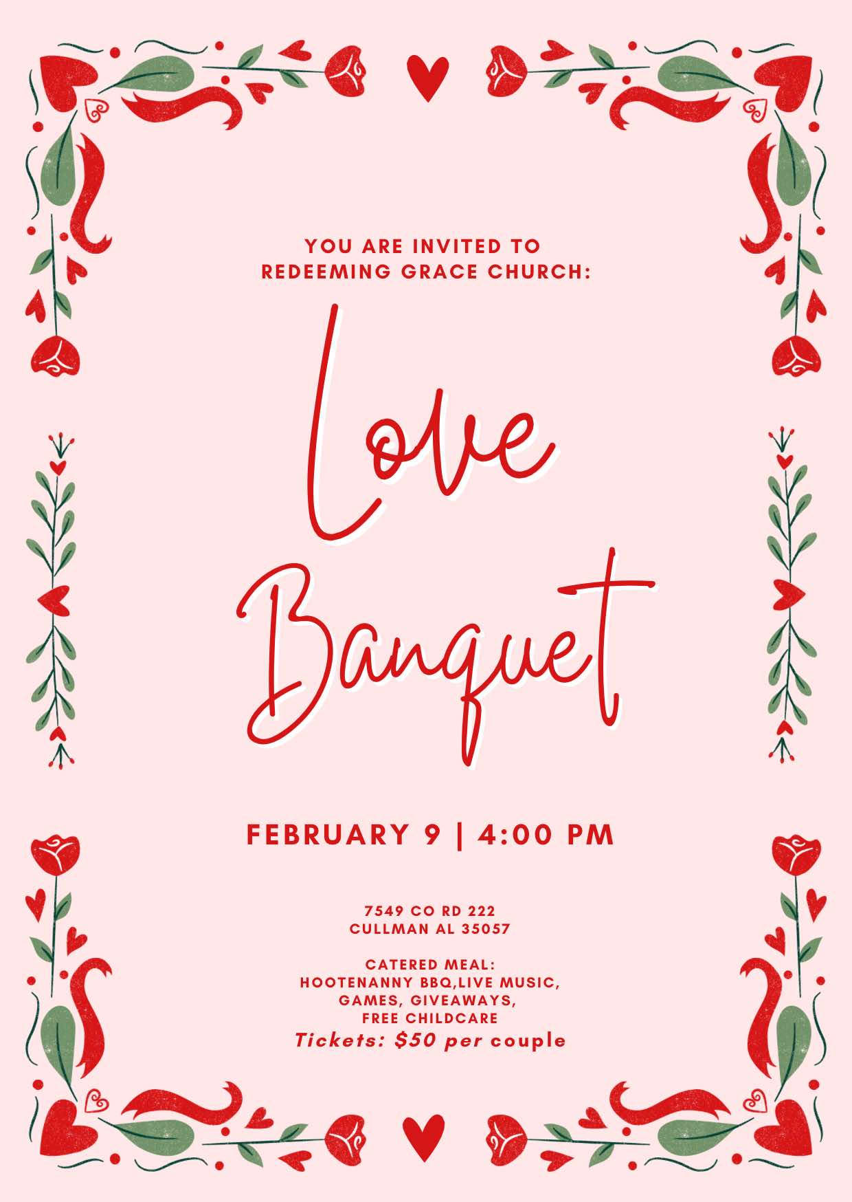 CULLMAN, Ala. – Couples looking for a special night out can enjoy an evening of food, fun and fellowship at the third annual Love Banquet, hosted by Redeeming Grace Church on Sunday, Feb. 9, at 4 p.m. The banquet promises a night packed with memorable experiences filled with live music, games and giveaways, all in support of a greater cause. Tickets are $50 per couple.