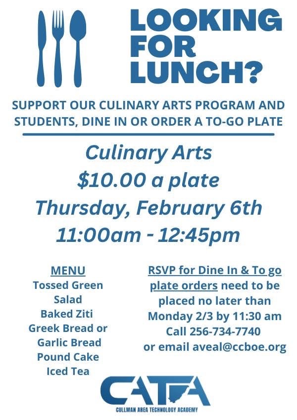CULLMAN, Ala. – The Cullman Area Technology Academy (CATA) Culinary Arts program will host a lunch on Thursday, Feb. 6, from 11 a.m.-12:45 p.m. at the school. The cost is $10 per person.