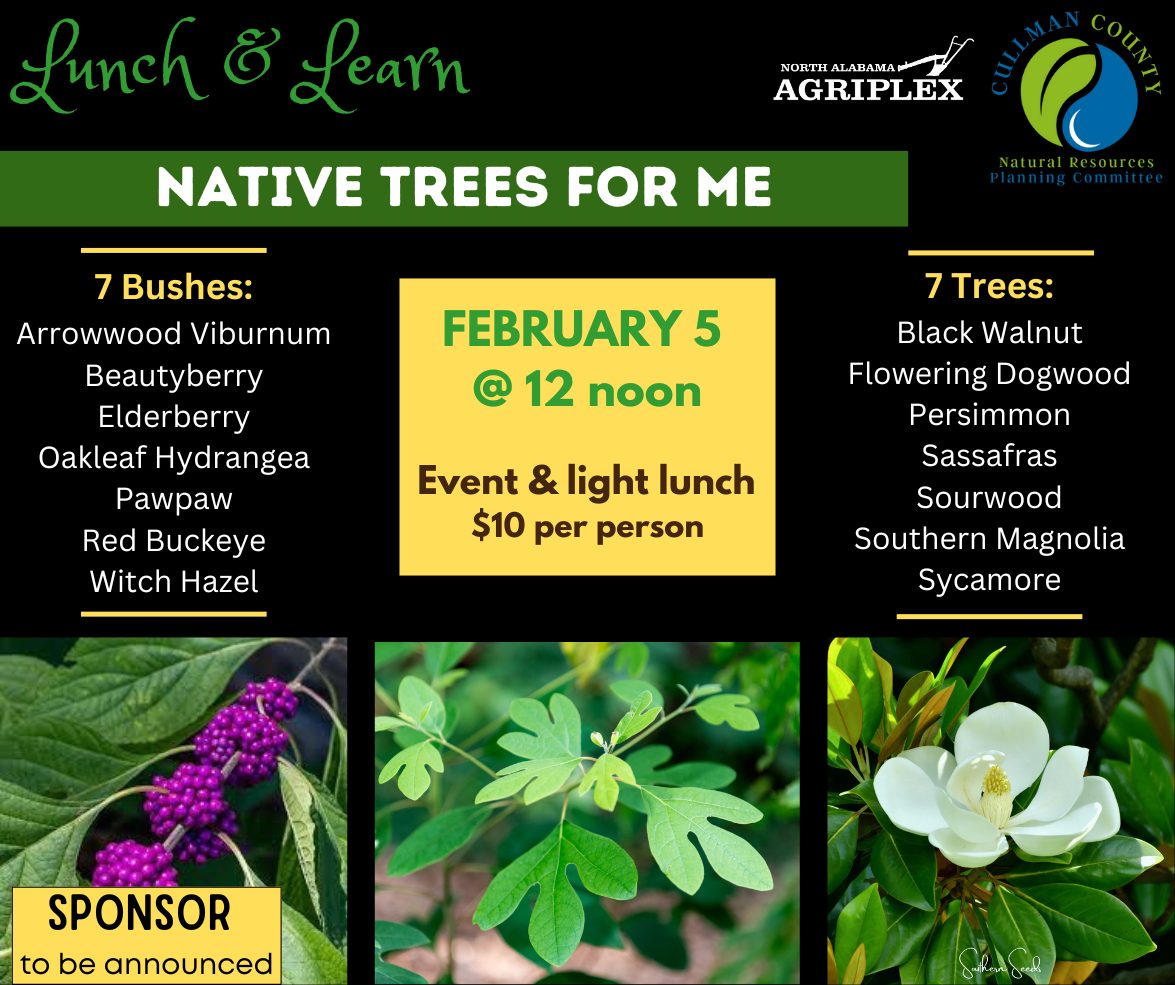 CULLMAN, Ala. – Cullman residents interested in planting native trees and shrubs can gain expert guidance at the upcoming Lunch & Learn: Native Trees for Me on Feb. 5 at noon. The event, hosted by the North Alabama Agriplex in partnership with the Cullman County Natural Resources Planning Committee, will be led by Cullman County Extension Coordinator, Dr. Kira Sims.