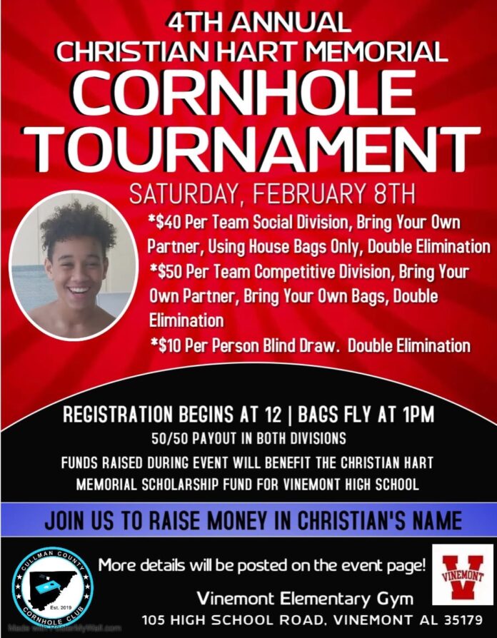 VINEMONT, Ala. – The fourth annual Christian Hart Memorial Cornhole Tournament is this Saturday, Feb. 8, at 1 p.m. in the Vinemont Elementary School gymnasium. Registration begins at noon.