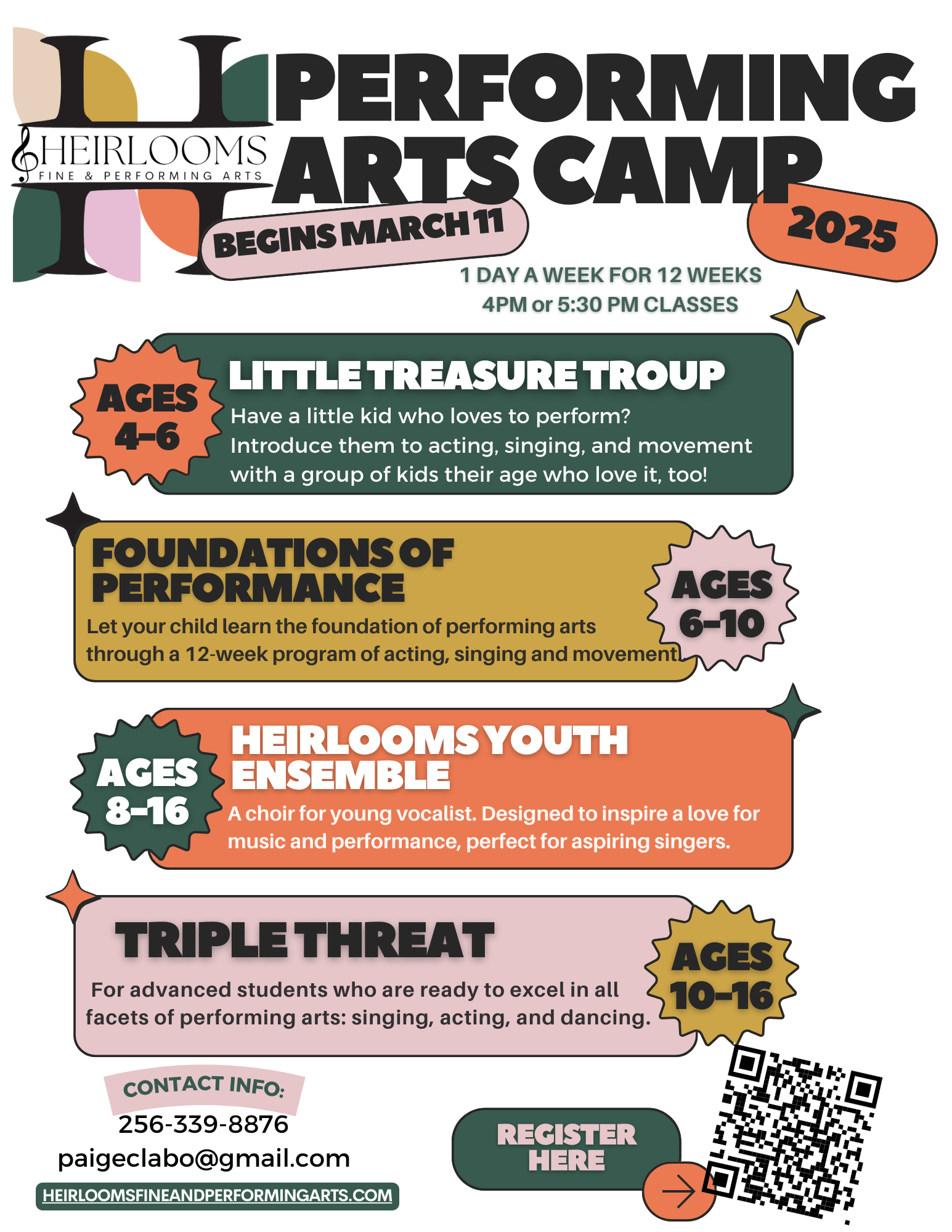 For those interested in enrolling, register at www.heirloomsfineandperformingarts.com. For more information on available programs or upcoming Performing Arts Camp, contact Paige Clabo at 256-339-8876 or paigeclabe@gmail.com.
