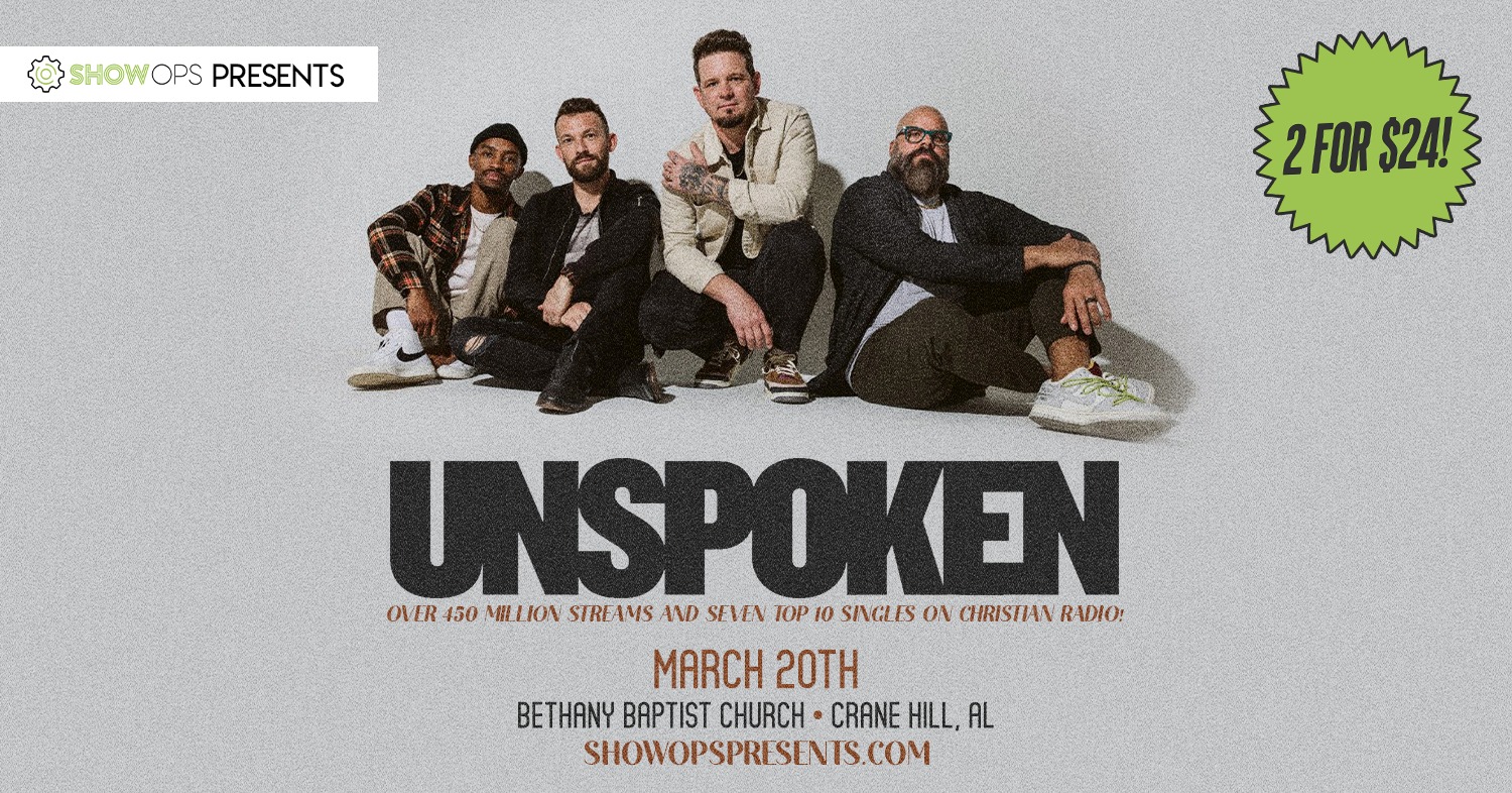 CRANE HILL, Ala. – Bethany Baptist Church in Crane Hill is set to host an evening of worship and music with the popular Christian band Unspoken on Thursday, March 20. Known for hits like “Start A Fire,” “Reason” and “Good Fight,” Unspoken has built a reputation for their soulful sound and faith-driven lyrics. As stated on the event page, “The band’s mission is to share hope and inspire faith through music.”